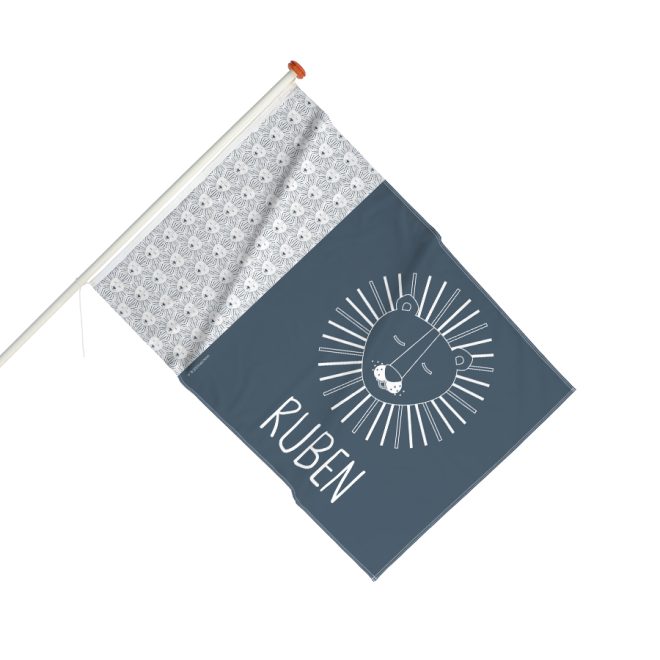 Vier de geboorte van je baby’tje met deze stoere geboortevlag met leeuw in donkerblauw.