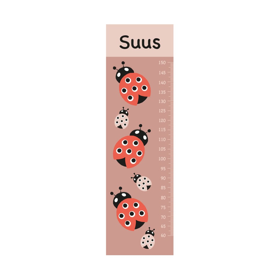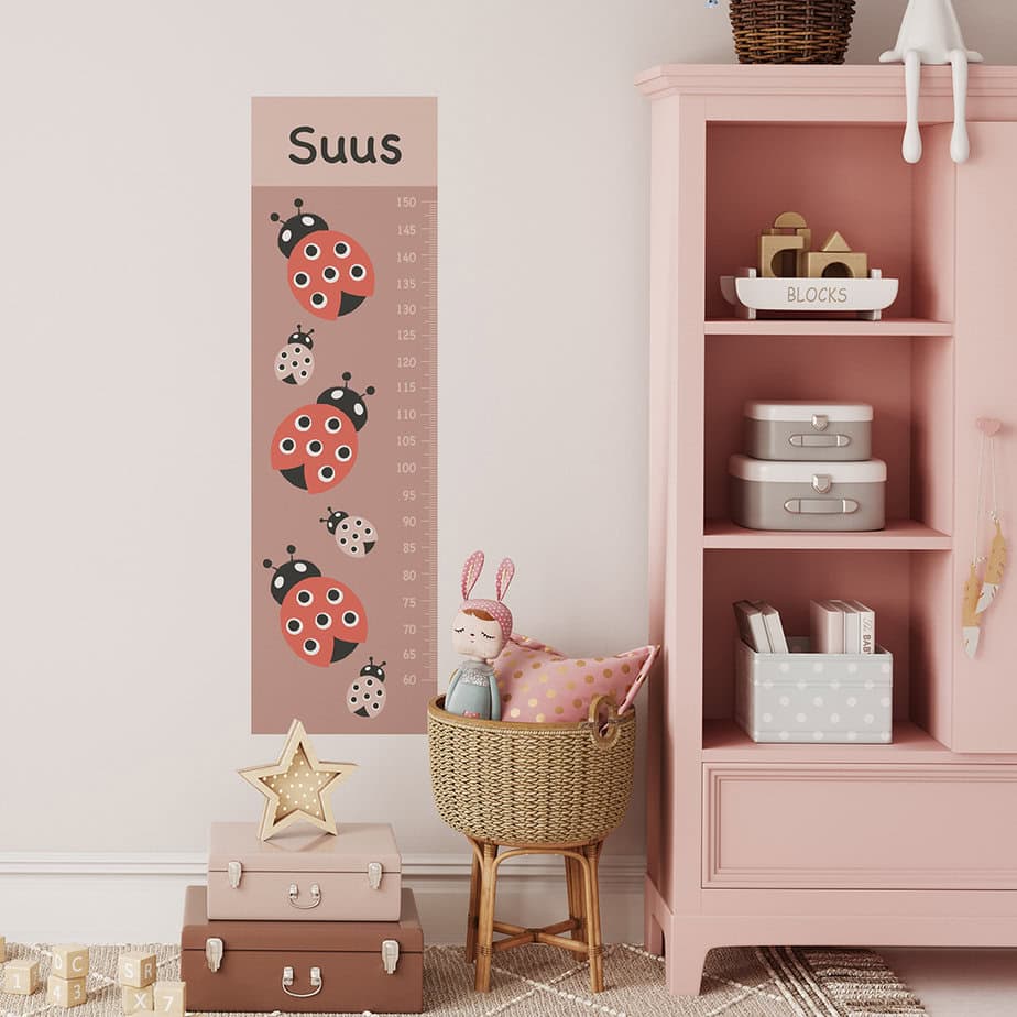 Geef een schattige sfeer aan de muur van de kinderkamer met deze groeimeter met lieveheersbeestjes in roze kleuren.