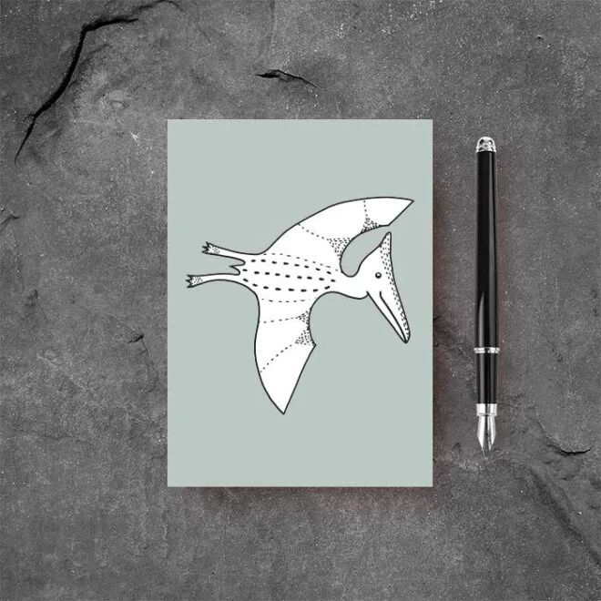 De voorzijde van de kaart is bedrukt met de vliegende dino in groen.