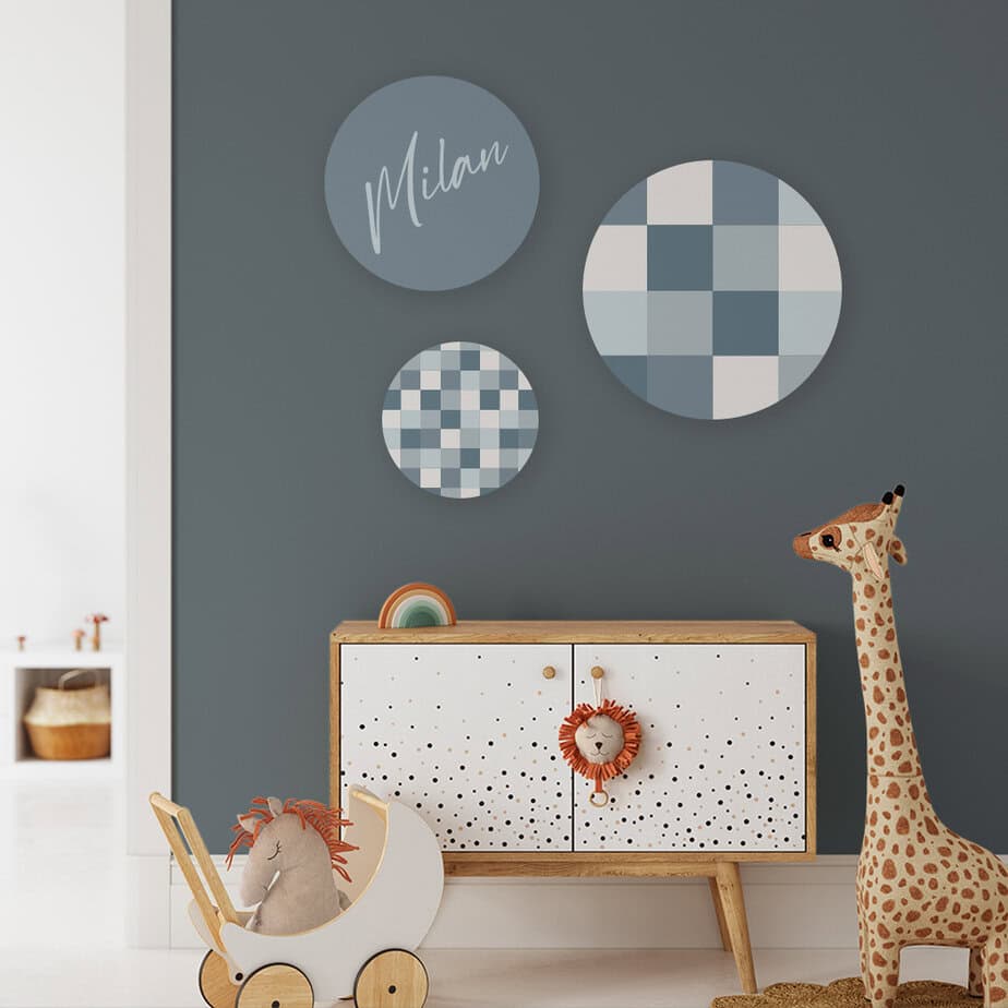 Deze muurcirkel met ruitjes in blauwtinten is precies wat je nodig hebt. Het ruitjespatroon geeft de muur een speelse en toch rustige uitstraling.