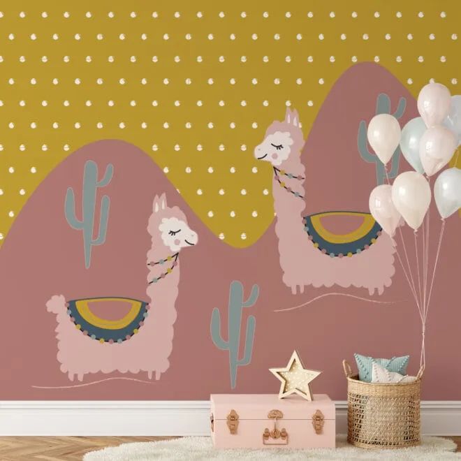 Vrolijk XL behang lama’s met oudroze en oker print voor de meisjeskamer.